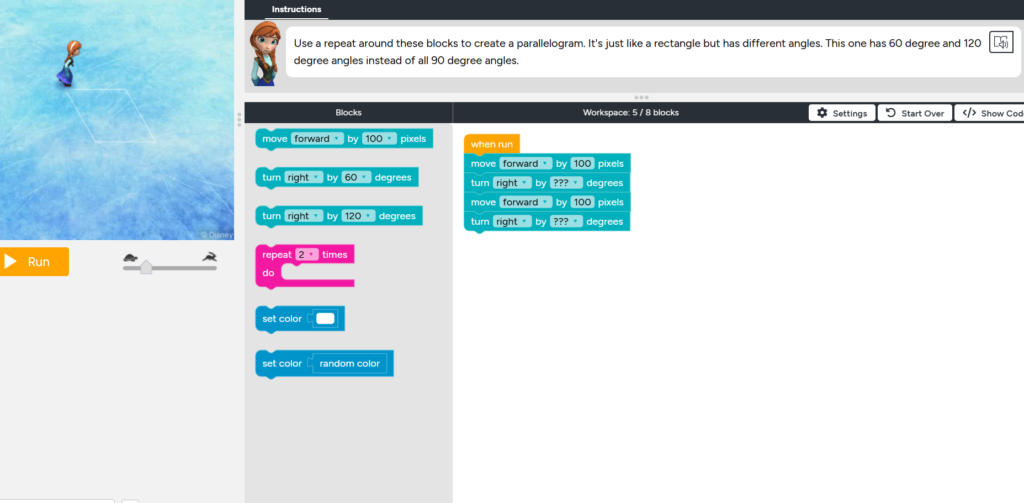 Here is a screenshot of myself working on the Elsa and Anna from Frozen in class coding activity. To be fully honest and transparent I found myself a bit confused while working on the coding activity as I have very limited coding knowledge. However, I found it fun and was beginning to pick up on it as we reached the end of the activity time and loved the gamification of coding!